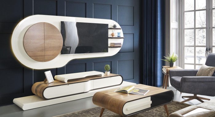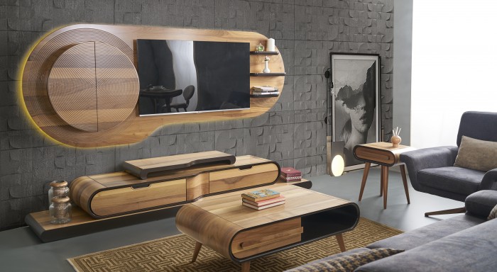 Televizyon Ünitesi MalzemesiGövde MDF üzerine doğal kaplama ile, ön kapaklar MDF üzerine lake boya ile üretilmiştir.